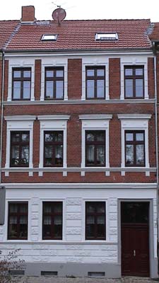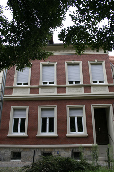 - Klinkersteinfassade mit aufgesetzten Faschen und hervorstehenden Bändern